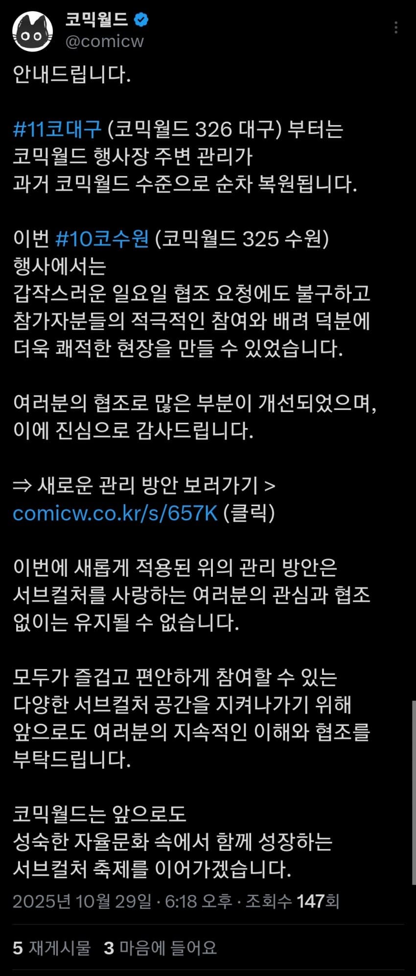 애들 심각한게 노란조끼 시절떄 운영한거를 잘한거라고 생각하고있음 이거 심각한거임 애초에 쓰레기나 담배문제는 옛날부터 심했는데 지들이 운영을 ㅈ도 못한고 관리인원 최소한으로 운영한것도 있을텐데 모든걸 다 코스어나 참가자 탓하고있음 | 25.10.29 20:01 | | |