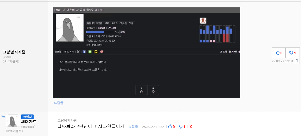 아이고 이사람아 그걸 내가 만들었냐 그 자료들을 다른사람들이 죄다 저사람 예전에 저런짓 하고 다녔던 사람 이에요 하고 저번에 저격 당햇을때 올라오던 짤들이야... 어짜피 내말은 안믿을텐데 좋을대로 생각해라 언쟁해봐야 대화가 안되는데 | 25.10.30 00:30 | | |
