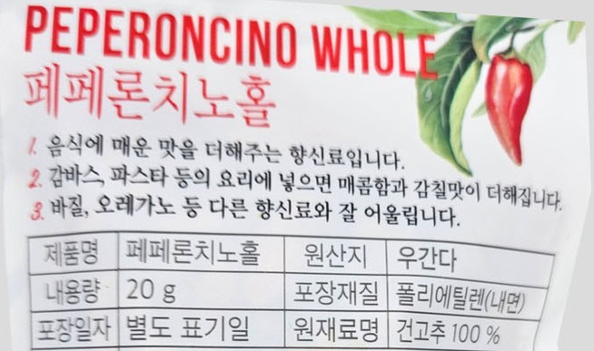 페페론치노 뒤에 잘봐야됨 분쇄 뭐 이런건 90%이상이 베트남 고추 뭐 이런거고 아프리카산 페페론치노 여야지 찐일껄?
