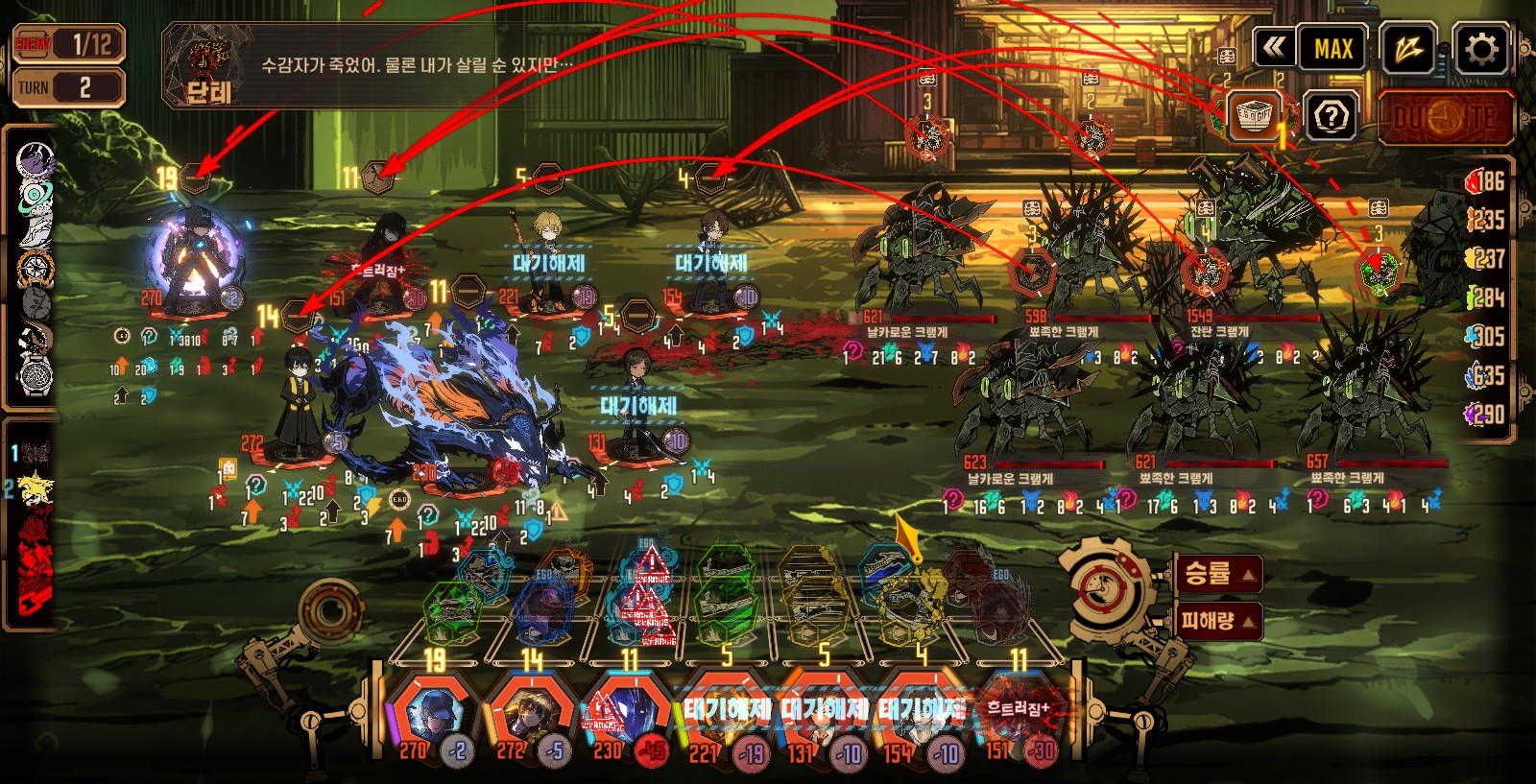 침잠키워드에선 1,2층 서릿발 발자국 합성하면 합위력 2 증가, 여기에 녹아내린 시계태엽도 공격레벨 3 다운시켜서 합위력 3깎아줌 한겨울밤의 악몽까지 모이면 매턴 합위력 2+1씩 깎아주는 조합이 됨 인연조각이 10렙이라 합수치 3.33정도라 보면 되서 얘네 모은거랑 비슷한 효과 이번턴 +코인 썼을떄 다음턴 정신력 45만들어주는 에깊인 믿음도 먹었다면 저기서 하산 안해도 됐을수도 있는데 아쉽네 | 25.11.04 23:44 | | |