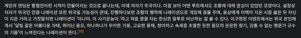 난 위국루트 나오면 어떻게 나올지가 궁금함 ㅋㅋㅋ 책 필자가 직접 내용 독백하는형태인데 본인루트에선 어떻게 나오련지