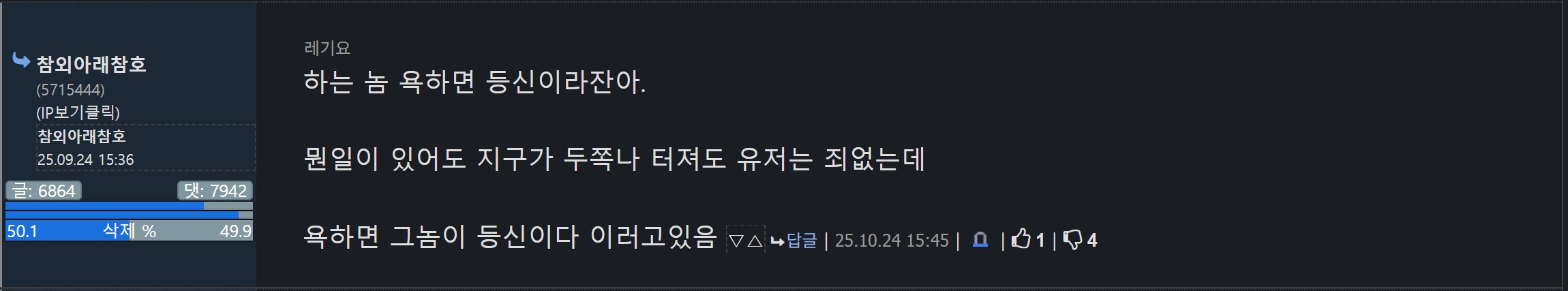 그런 주제에 자기는 비판 받기 싫어하는거야? 내로남불 개쩌네~ 라고할뻔~ | 25.11.08 07:46 | | |