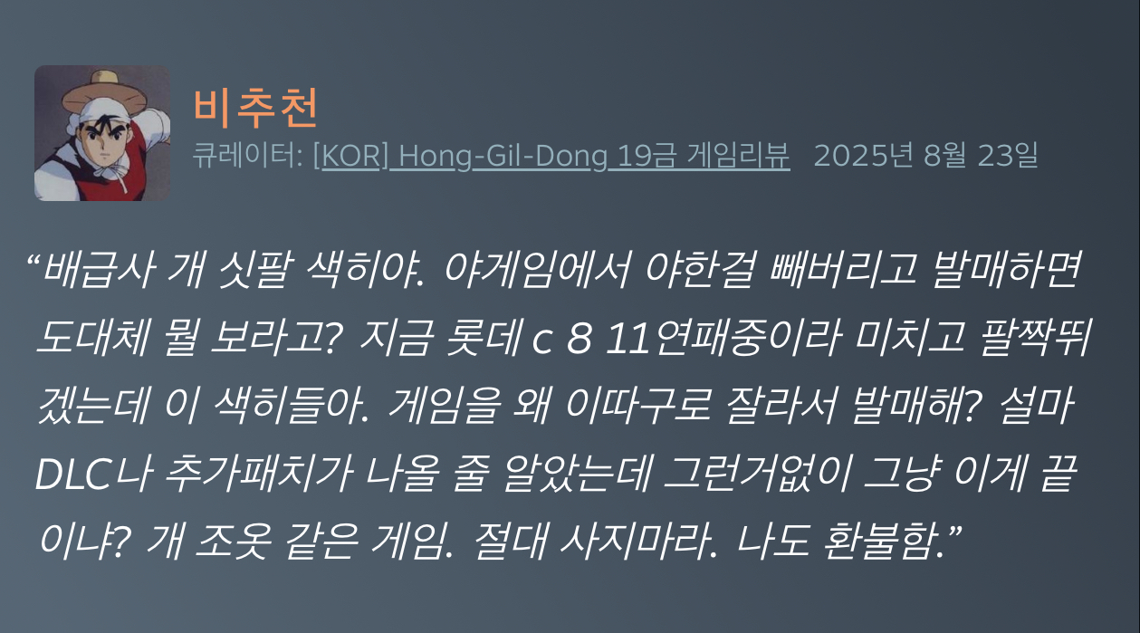 난 호감임. 리뷰 보고 게임 샀습니다 라고 리뷰에 댓글 남겼더니 호다닥 달려와서 이거 똥겜이니까 80% 할인하면 사라고 말해줬거든. 덕분에 똥 피해갔음. | 25.11.13 05:11 | | |