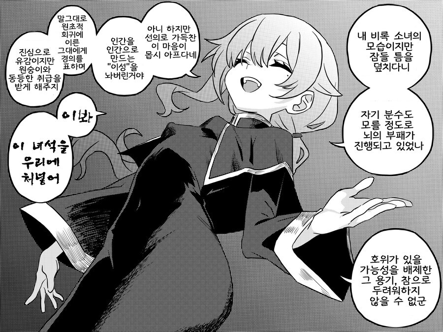 "원숭이와 동등한 취급을 우리에서 해주겠다는 얘기는 러브호텔에서 쥐어짜주겠다고 했다고 '역시 자지에는 이길수 없나'하는 엔딩이겠지! 진실은 언제나 하나!"