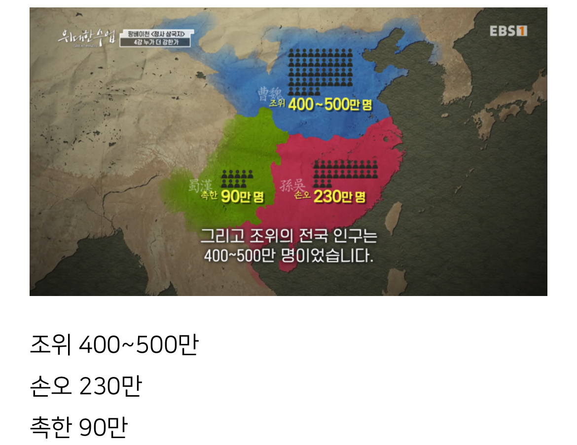 그거야 촉은 한나라 시절에 이어서 구전산부제라 인구는 제대로 등록 안하는 풍조가 있었겠죠. 혹은 촉이 위나 오에 비해 호족의 장원에 예속한 인구가 많았다고 보는 견해도 있습니다. 요 근래에는, 인구 자체는 건국시에 400여만, 멸망 시에는 그보다 좀 더 늘었을걸로 추산한다고 본 적이 있습니다. | 25.11.16 20:36 | | |