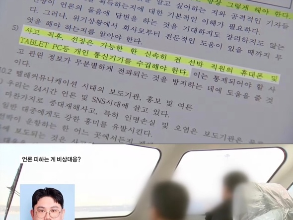 사고시 비상 대체 요령이 배를 어떻게안전한 곳으로 몰 것인가 구명 장비 어다 둘 건가 대피 어떻게 할건가 불어떻게 끌건가 보다 탑승자 휴대전화 처리하고 언론 접촉 막고 쉬바 이런거 밖에 없어 | 25.11.23 15:59 | | |
