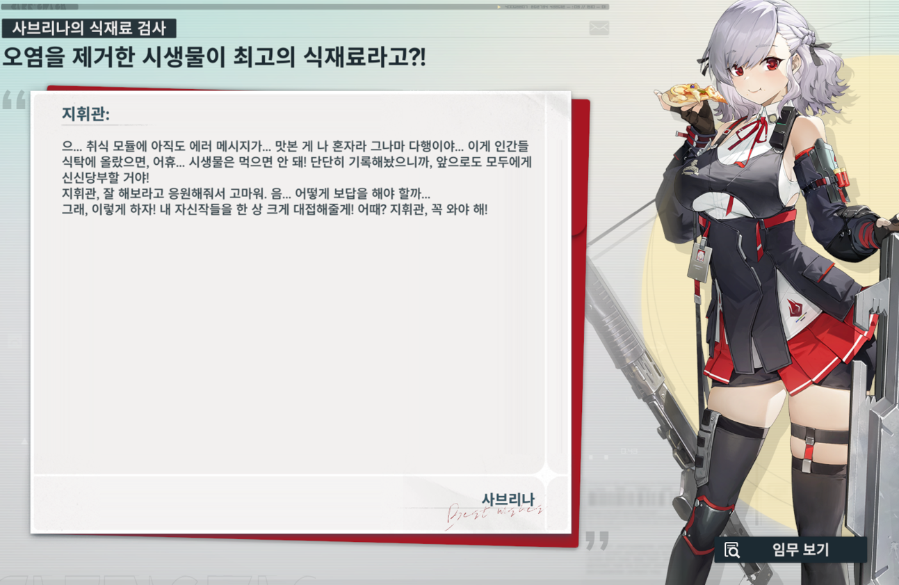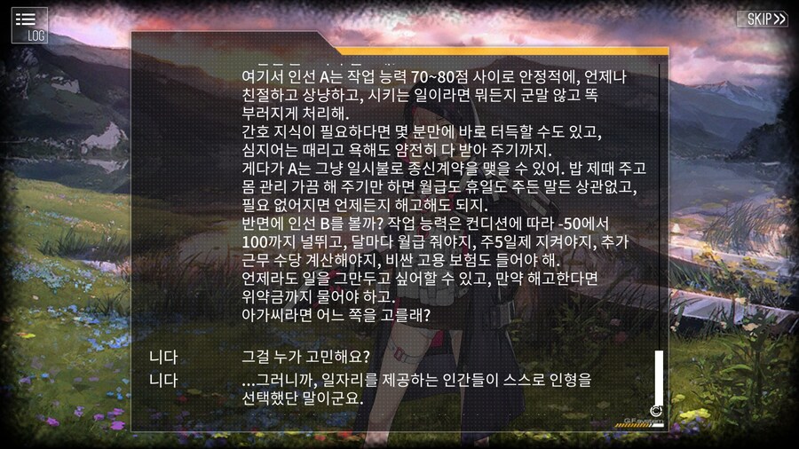 물론 살림이 넉넉한 화이트존에서 그런 식사를 즐기는 인형을 굳이굳이 '자원이 모자란데 축내서' 싫어하는 사람은 없다 하지만 보통 '전술인형'이 마주칠만한 사람들은 화이트존 바깥의 사람들인게 문제...