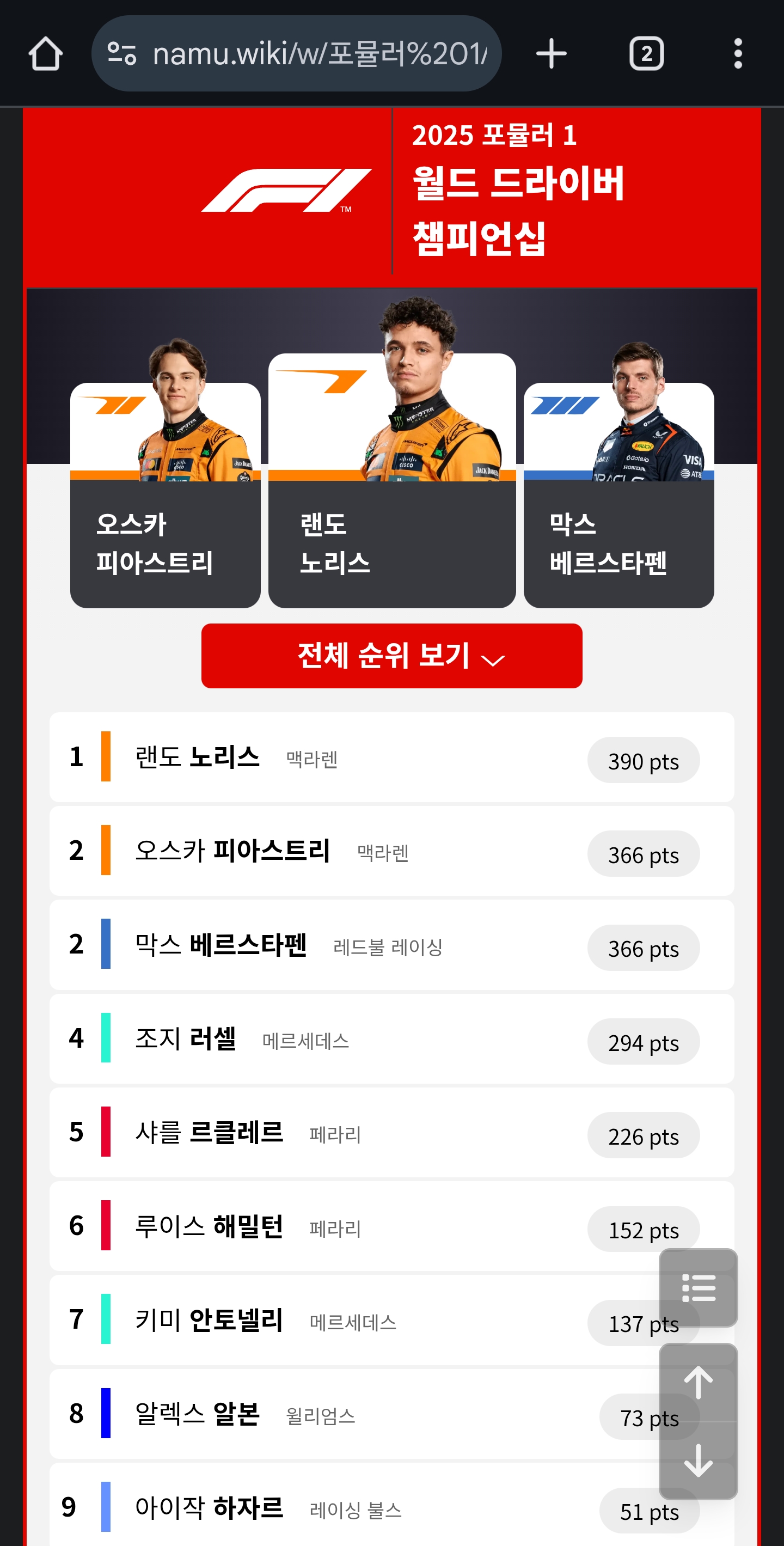 둘 다 실격되는 바람에 점수변화가 없어서. 남은 두 경기에서 베르스타펜이 1등하고 노리스 성적이 부진하면 역전할 수 있음. | 25.11.24 01:52 | | |