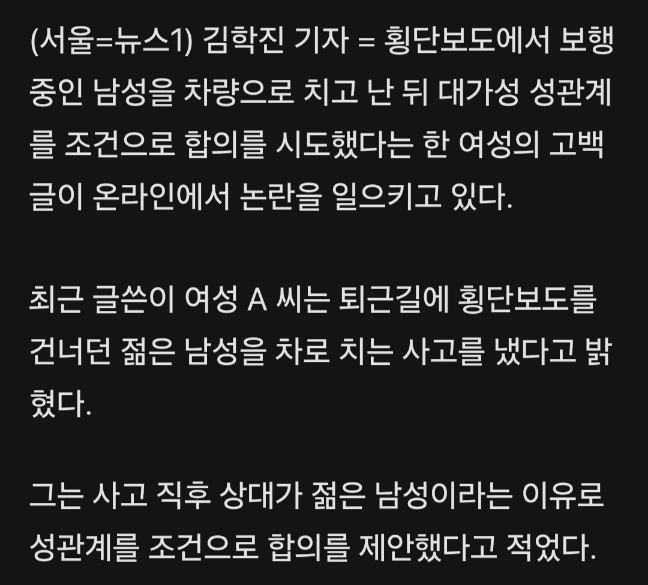 횡단보도에서 보행 중인 남성을 차량으로 치고 난 뒤 대가성 성관계를 조건으로 합의를 시도했다는 한 여성의 고백 글이 온라인에서 논란을 일으키고 있다. 그냥 옛날 썰 변형해서 올린 개구라 글 기사로 쓴거 같은데