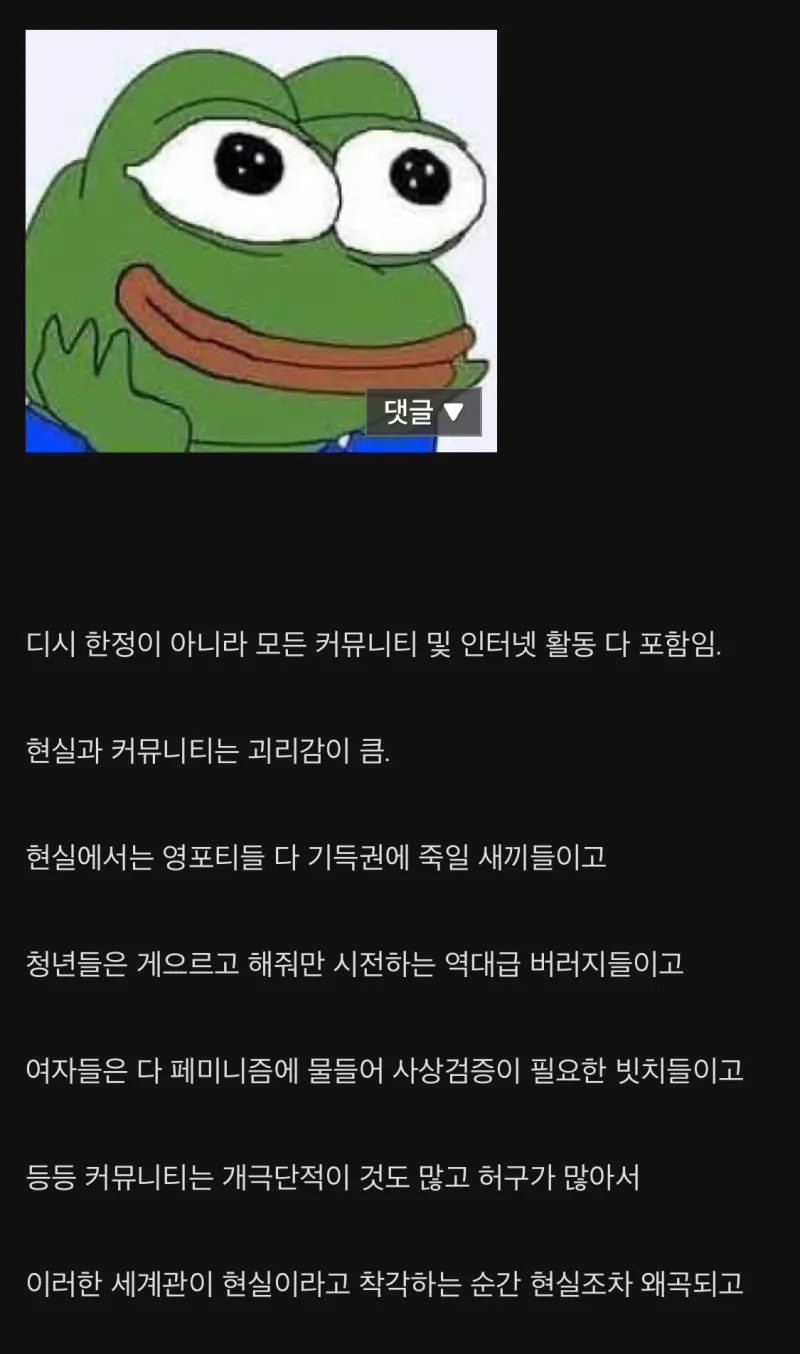 커뮤가 독인게 아니라 현실에서 즐길 거 없는 망한 사람들이 득시글 거리는 건 아닐까