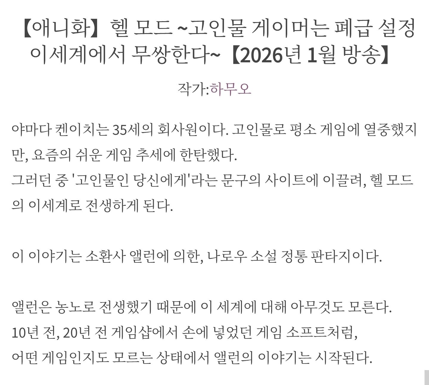 딴데서 이어서 가든 처음부터 하든 해볼라고 했던 것 같기는 한데, 소학관 가가가라서 계약하기 힘든 것도 있고, 이래저래하는 사이에 코로나도 있었고 라노베 시장 팍 죽어버려가지고 결국 흐지부지 된 것 같더라고. | 25.11.30 21:39 | | |