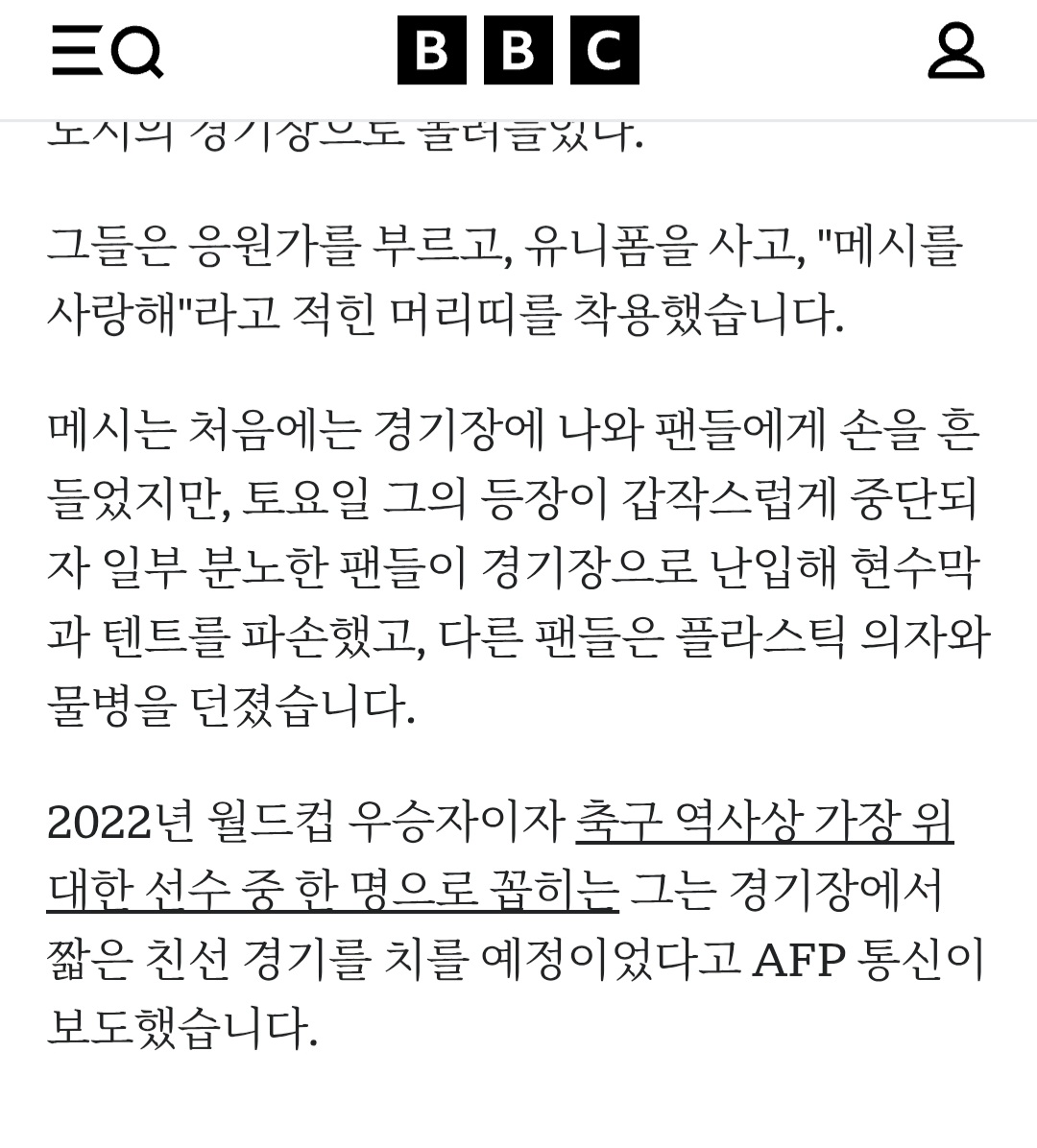 기사 찾아보니 원래 45분 예정이였는데 20분만에 간거라는데? 메시잘못인지 운영진의 독단인지는 모르겠다만.. | 25.12.14 20:47 | | |