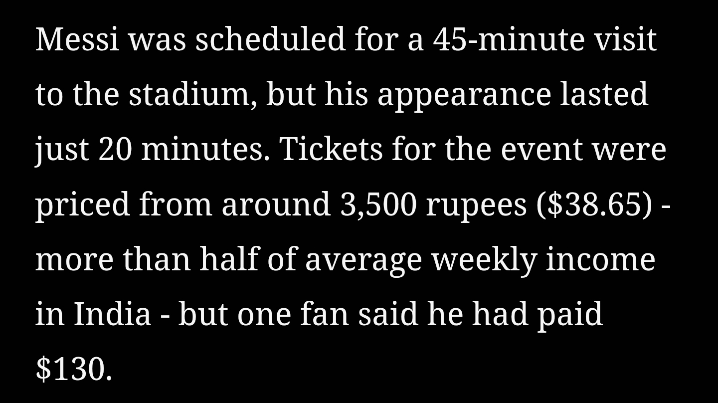 ㅇㅇ인도인들 인스타 반응을 봐도 대체로 주최측과 정치인들을 욕하는 분위기가 지배적. 메시 하이데라바드 일정은 제대로 치러졌다는 이야기에 "다행이다."라는 반응도 많이 봄. 다만 어디까지나 내가 확인한 건 인스타 반응이라는 건 명시해 둠. | 25.12.14 20:55 | | |