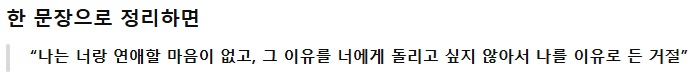 그래서 난 결혼못한다..너랑 사귀더라도 너한테 쓸돈이 한정적이다.. 시간낭비실거다란것도 결국 나랑 사귀어봣자 결혼도 못할텐데 그냥 다른사람만나라 이거지 뭐.. | 25.12.15 10:41 | | |