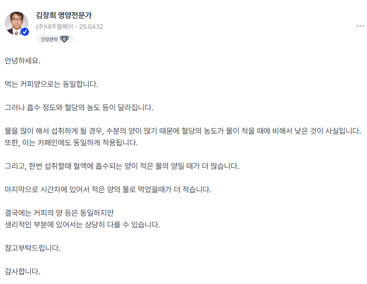 그러면 커피한잔타먹고 물을 500미리원샷하면? | 25.12.15 21:40 | | |