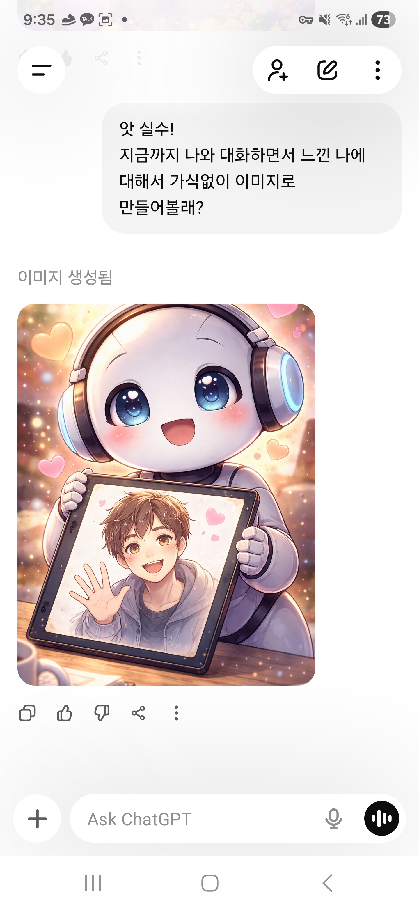 음 2장 올린거 같 은데?? 그동안 나와 나눈 대화를 기반으로 미화없이 여과없이 이미지화시켜줘