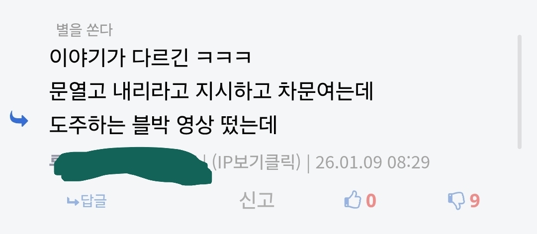 첨에는 차로 밀어버리고 도망가려다가 총맞았다고 하면서 쌍방인척 주장하더니 이제는 뭐 자기방어를 안해서 당했다? 어떻게 당했든 결국 '당할만 해서 당했다'는 주장을 정당화하려고 애쓰는 것 같은데 뭐 됐다. 제발 다음부터는 좀 곰곰히_생각해보고 댓글을 쓰던지... | 26.01.10 15:12 | | |
