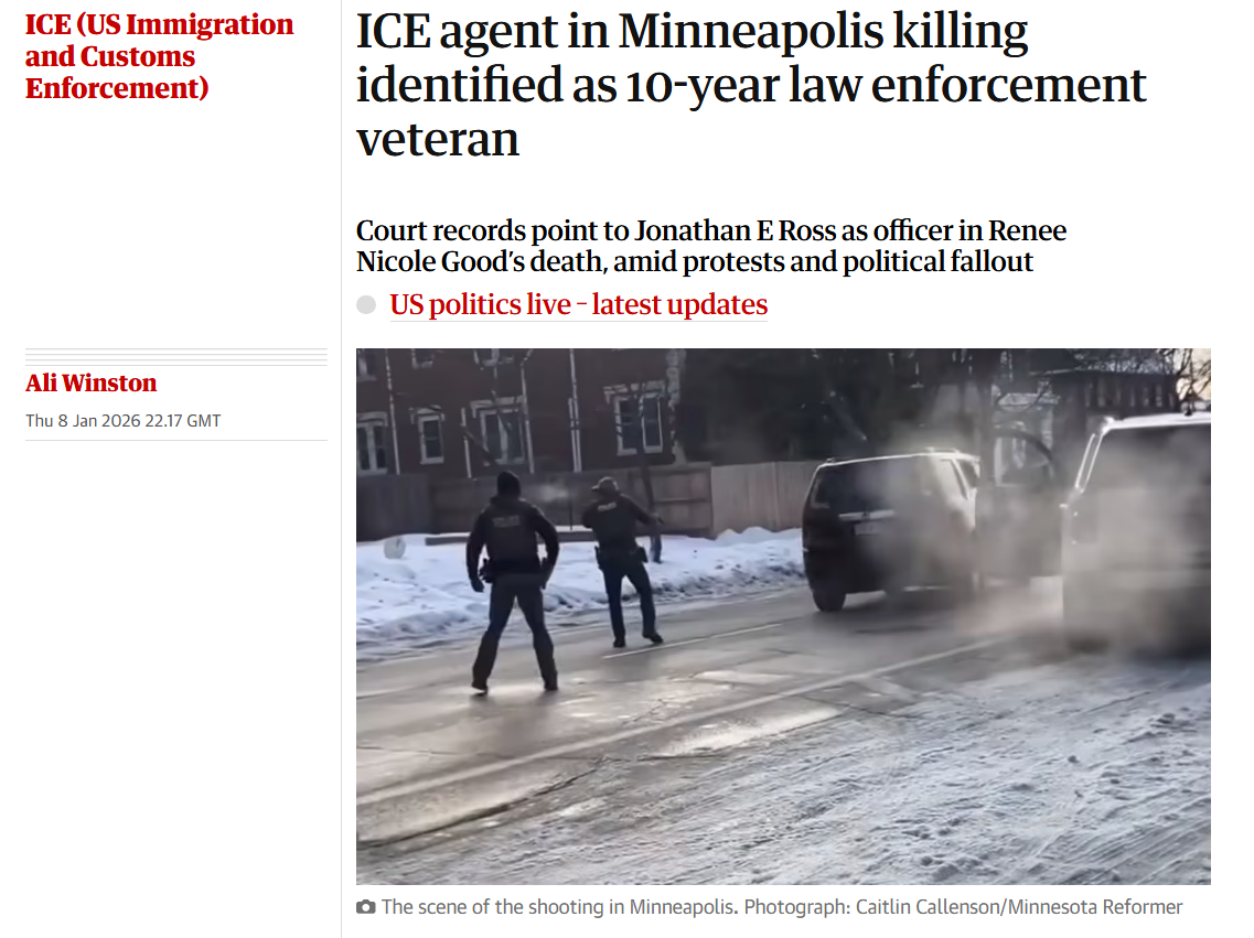 저 쏜 새끼 신상에 의하면 ICE 10년차 베테랑이라는데 10년짜리 짬밥을 죄다 똥구멍으로만 처 먹은듯 https://www.theguardian.com/us-news/2026/jan/08/ice-agent-minneapolis-shooting | 26.01.10 14:13 | | |