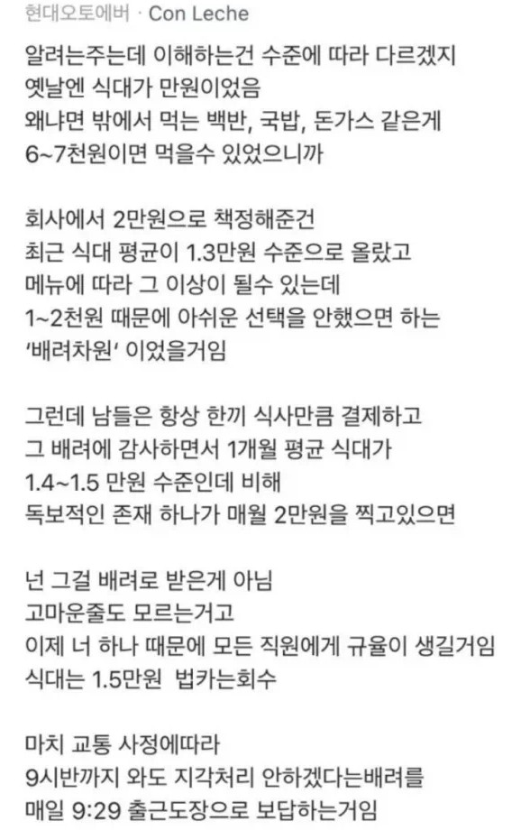 식대가 2만원돈 이라는건 "요즘 물가로 대충 1만~1만 5천정도 먹겠죠? 그래도 1.5는 좀 빡빡하니 2로 해주죠" 이런 호의로 생기는건데... | 26.01.17 22:11 | | |