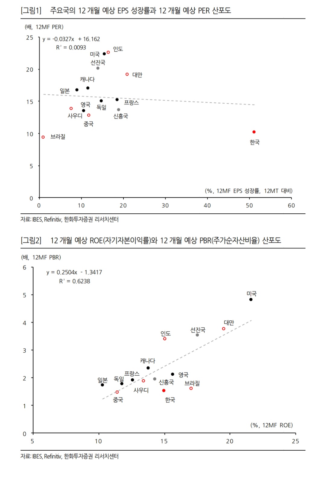 어제자 한화투자증권 리포트 pbr-roe차트 한국 아직도 저평가임 반도체 ai붐하고 상법개정으로 roe 엄청 올랐는데 아직 주가는 못따라감