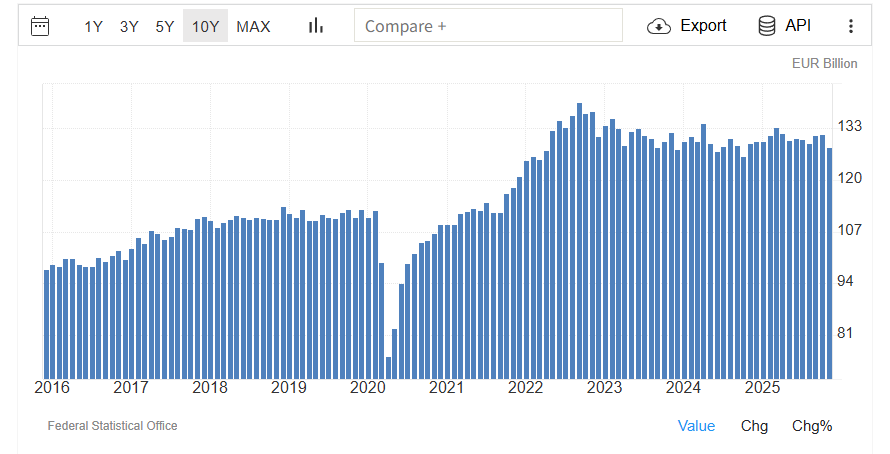 독일 10년간 수출 데이터인데 러우전 터지고 가스관 잠그기 전까지는 꽤나 성장이 잘 되었음. 문제는 러우전 터지고 에너지 비용 증가하면서 수출 증가가 정체되기 시작함. | 26.01.23 16:03 | | |