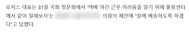 저거 의원이 당시 쿠팡 야간 업무의 고충을 알기 위해 직접 체험하려고 하는데 같이 할 의향있냐고 해서 같이 할 의향 있다고 대답한 거긴 한데 그래도 런은 추하네