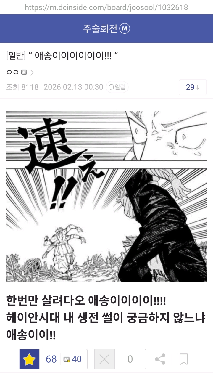 너가 만든 괴물이다 마히토 ㅋㅋ 스쿠나가 주술적 스승이라면 싸움에 대한 각오는 너땜에 다 만들어졌어 | 26.02.13 10:51 | | |