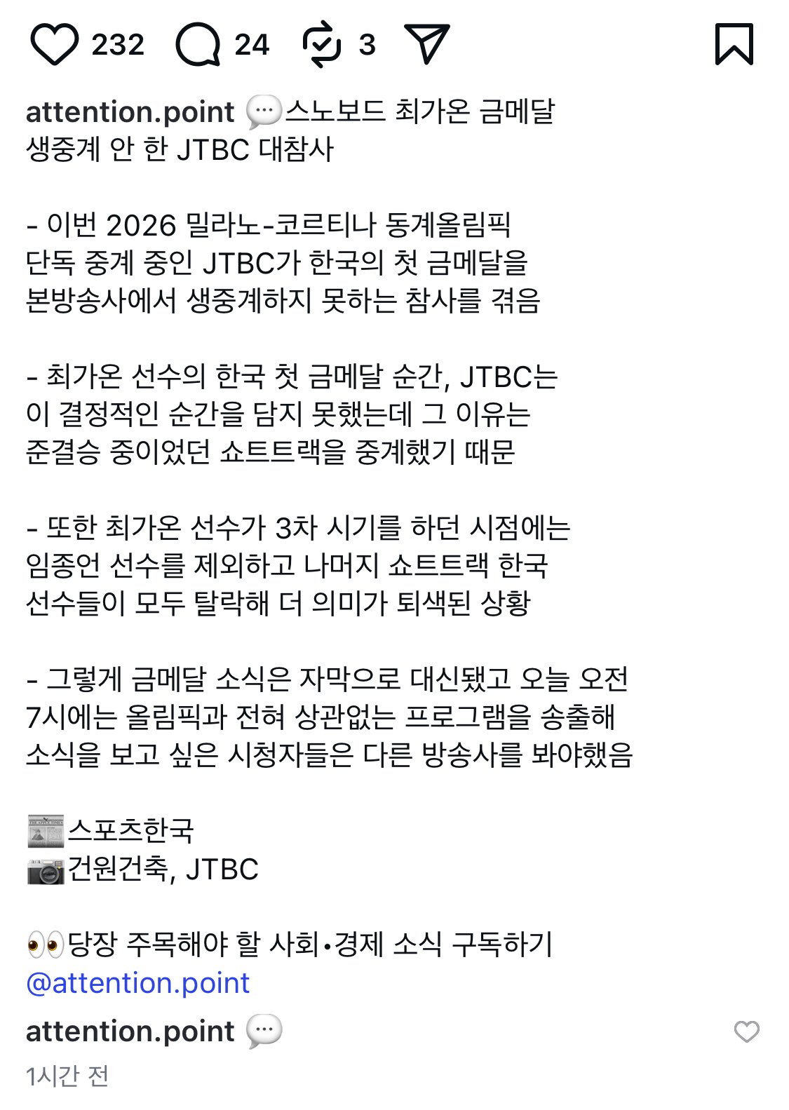 JTBC 스포츠 채널로 옮겨서 중계는 끝까지 했음. 근데 JTBC 메인 채널에서 중계 안했다고 저렇게 이야기 하는 거. | 26.02.14 20:04 | | |