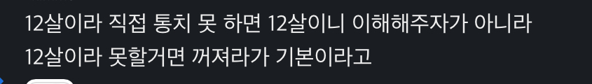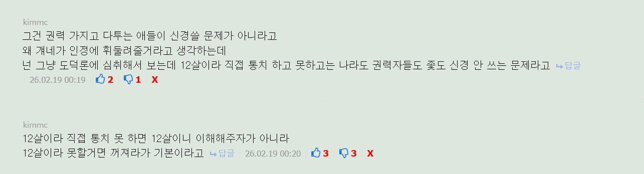 내가 12살이 물러나야 한다고 했냐? 아니면 권력자들이 12살이라고 안 봐준다고 했냐? 문맥 쳐내고 문장만 잘라오고 나서 왜곡 안했다 주장ㅋㅋㅋㅋㅋㅋ | 26.02.19 01:35 | | |
