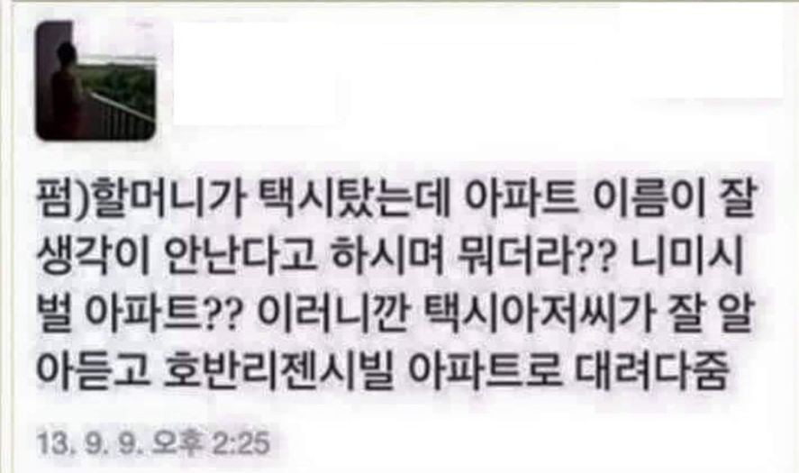 ??? : 니미씨발 아파트가 어디야? ??? : 왜 욕을 하고 그러세요. -_-