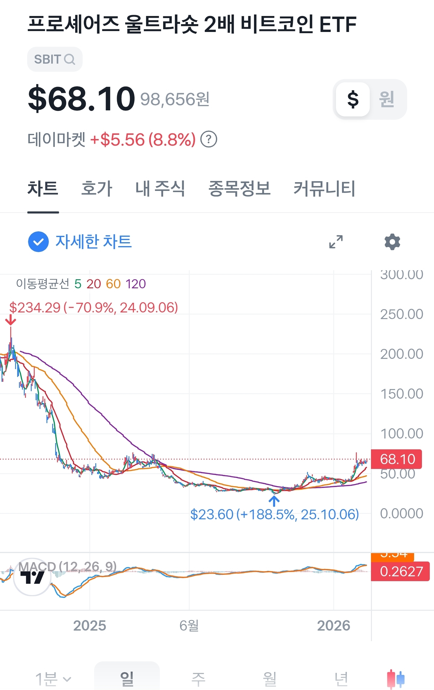$SBIT 비트코인 ×-2 숏 1월 14~15일 즈음에 탔으면 +100% 가능했을듯 | 26.02.23 12:20 | | |