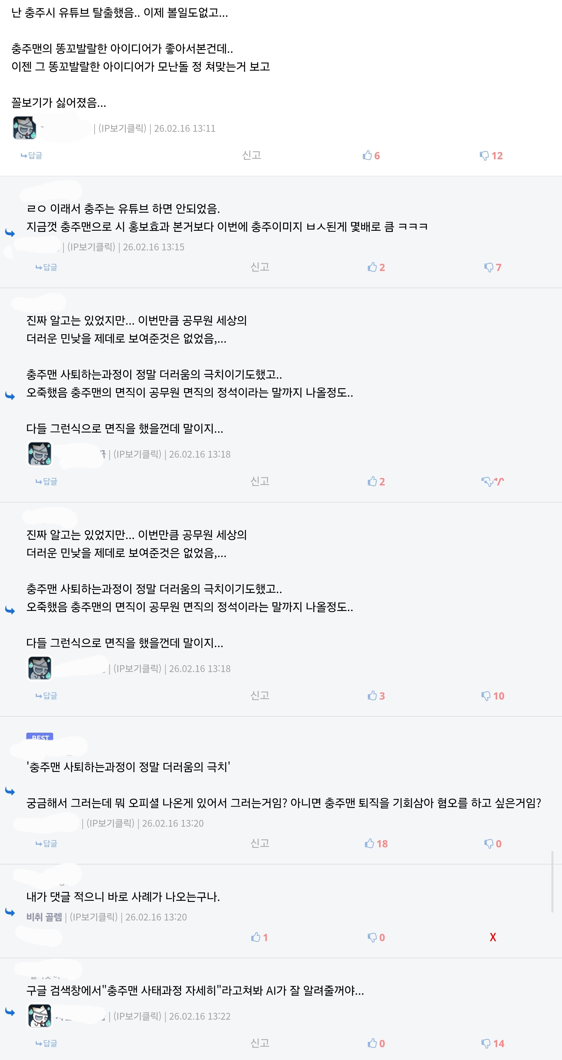 본문에 나오는 "이 친구들 논리에 따르면 대부분의 구독자가 결국 충주시 시정소식이나 문화행사 지역상품 이런거 ㅈ도 관심없는데 충주맨이 웃겨서 충주티비를 구독하게 된거라면" 에 대한 댓글로 "근데 충주맨이 웃겨서 구독한거잔아요 거기에 충주 홍보를 곁들인거임" 이라고 댓글 단거고 그리고 "‘홍보’담당자로서 존나게 실패한거고 주객이 전도되서 시 홍보채널이 개인채널이 되었다는건데" 홍보담당자로서 존나게 성공한거라고 생각합니다 | 26.02.25 12:16 | | |