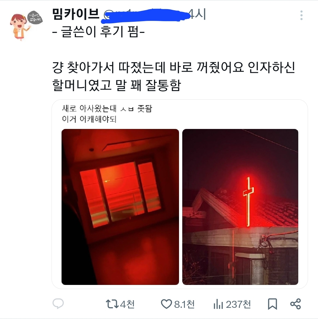 저거 교회만 달 수 있어 교회 아닌 찐 가정집이면 걍 빛 공해로 신고해 | 26.03.16 10:25 | | |