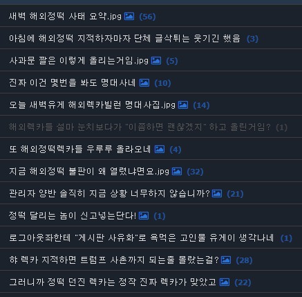 어거지? 그럼 해외정떡으로 이게 유머게인지 해정게인지 모르겠단 인간들이 주구장창 유머글 하나 없이 렉카 성토글만 주르륵 올리는 건 뭐 유머글인가 보지? 그렇게 규칙에도 없는 거 기붘 따라 공격하는 건 자존감 채우는 거 아닌가봐? 다음은 뭐야? 버튜버게인지 모르겠다? 야구게인지 모르겠다? | 26.03.17 09:25 | | |