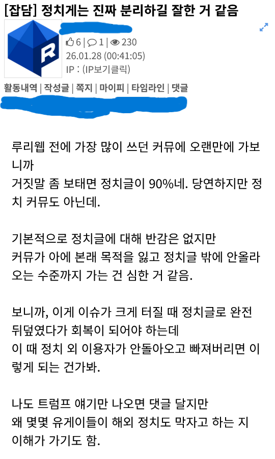 내가 정떡이나 시사떡밥을 보고 싶으면 애초에 루리웹에선 북유게 사정게를 가고 그게 아니면 뉴스를 보러가지 왜 내가 굳이 여기서 피곤하게 가치론 싸움까지 하면서 가벼운 마음으로 웃으려고 온 유게에서 정떡이 은은하게 섞여있는 시사까지 먹어야하는 건지 모르겠다 | 26.03.17 04:59 | | |