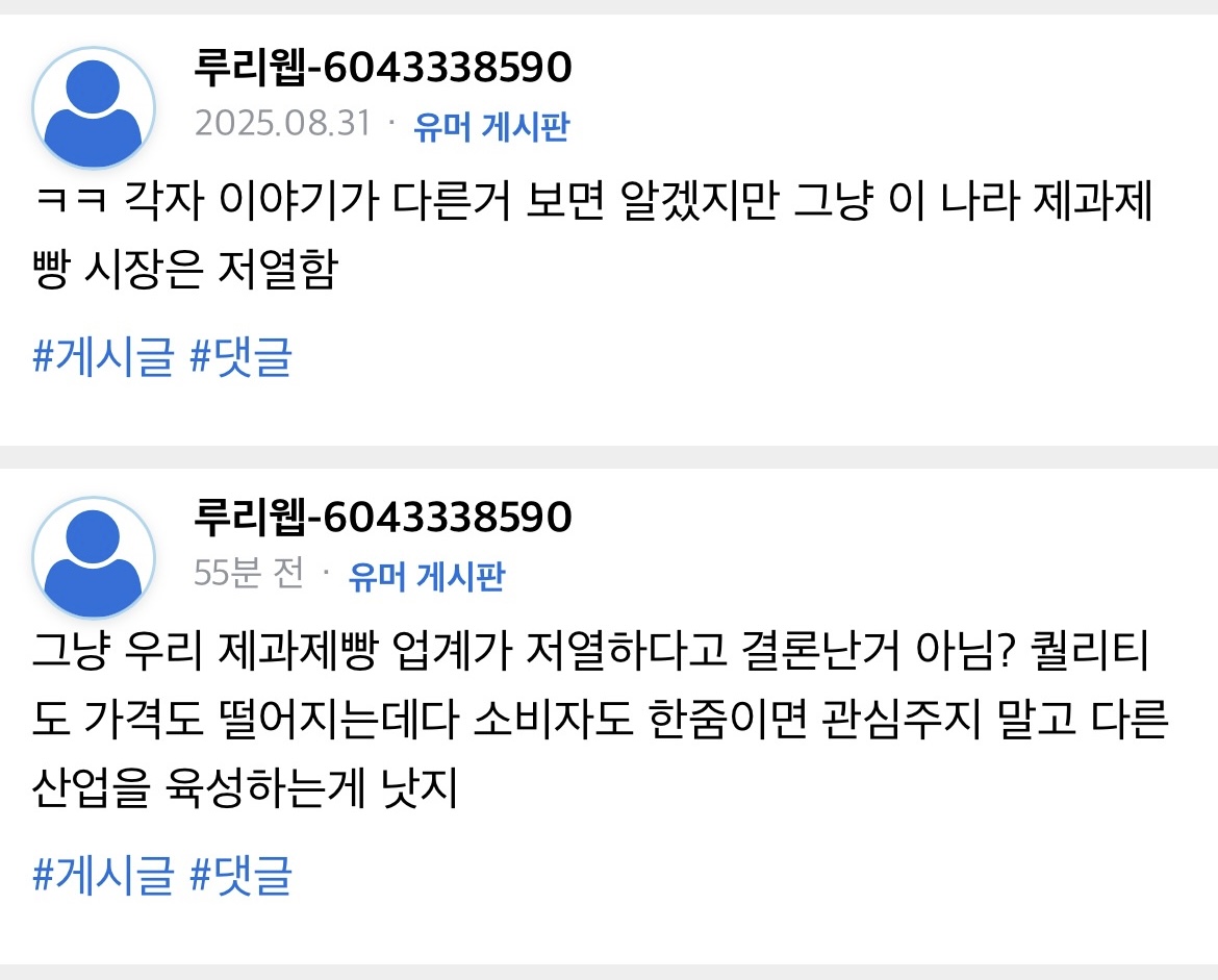그래그래 담합하고 사람 갈린 빵 많이 처먹어라 | 26.03.21 14:29 | | |