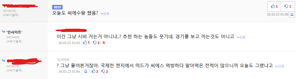 가장 아찔했던 거 쵸비가 이번 매치에서 캡스보다 잘한 건 아니다만 1,2세트 바텀에서 터진게 너무 컸는데 씨에수왕 비하맘 쓰고 그냥 물어본거잖아 ㅇㅈㄹ | 26.03.22 01:47 | | |