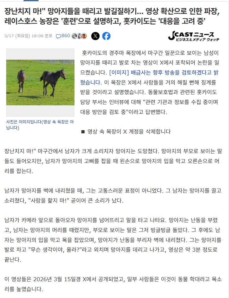 부연 설명 마방에 카메라 달아놓고 매일매일 성장과정 촬영하는 말이 있음 근데 그 말 키우는 목장에서 말한테 폭행하는게 카메라에 찍힘 난리났는데 그 목장 아니면 카메라 찍는 말 받아줄 목장 없어서 결국 마주가 사과하고 목장은 정상운영중
