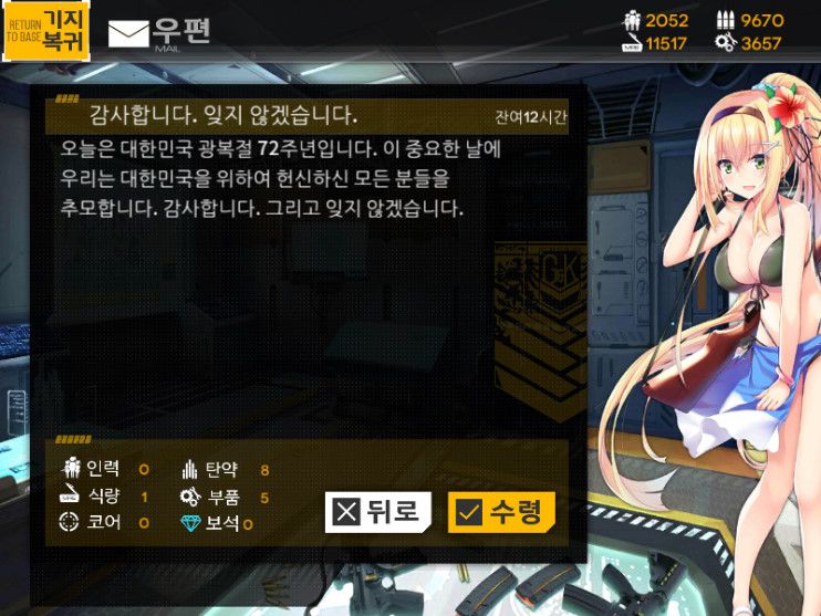 광복절 = 8월 15일이니까 준거임. 참고로 인력, 탄약, 식은 3분마다 3씩, 부품은 3분마다 1씩 회최대치까지 자동으로 회복됨. | 26.03.23 23:13 | | |
