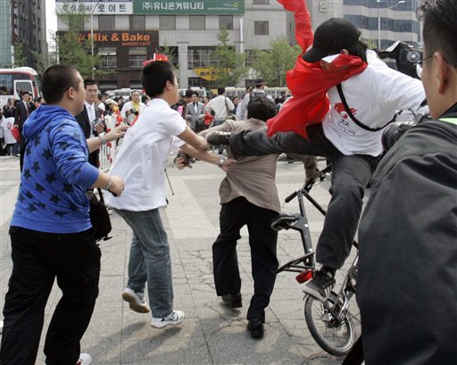 그런데 갑자기 중국 정부 비호하는 대학내 중국 유학생들이 단체로 몰려와서