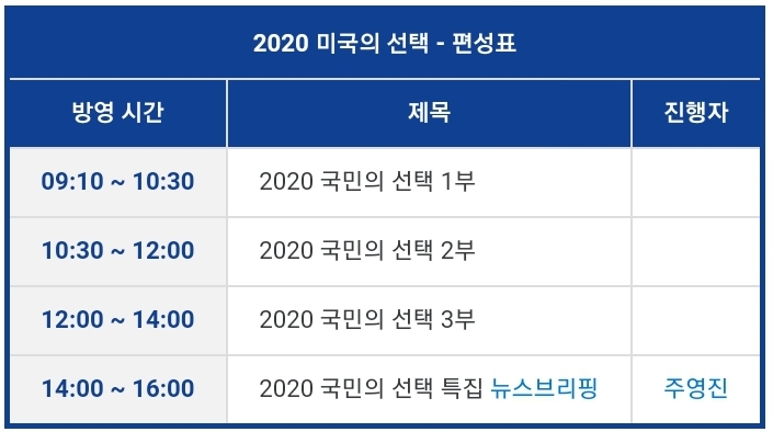왜 미국 선거 방송을 틀어주는지가 이해가 안되서 그랬는데, 예전부터 해왔던 거구나. 예전에 아들 부시 1차 임기때는 뉴스 꼭지로만 본 기억이 있어서 급 당황했음. | 20.11.02 11:26 | | |