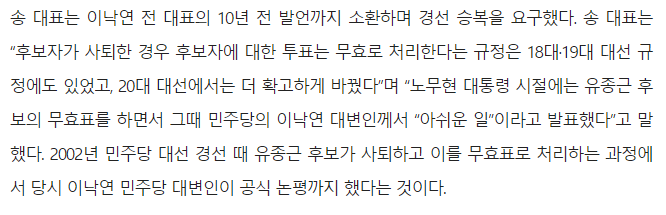 ※ 2002년 경선 때, 사퇴 후보가 사퇴 전 유효한 후보 신분일 때 득표한 것까지 무효 처리한 것은, 그 오류를 미처 깨닫지 못하고 진행한 것.
