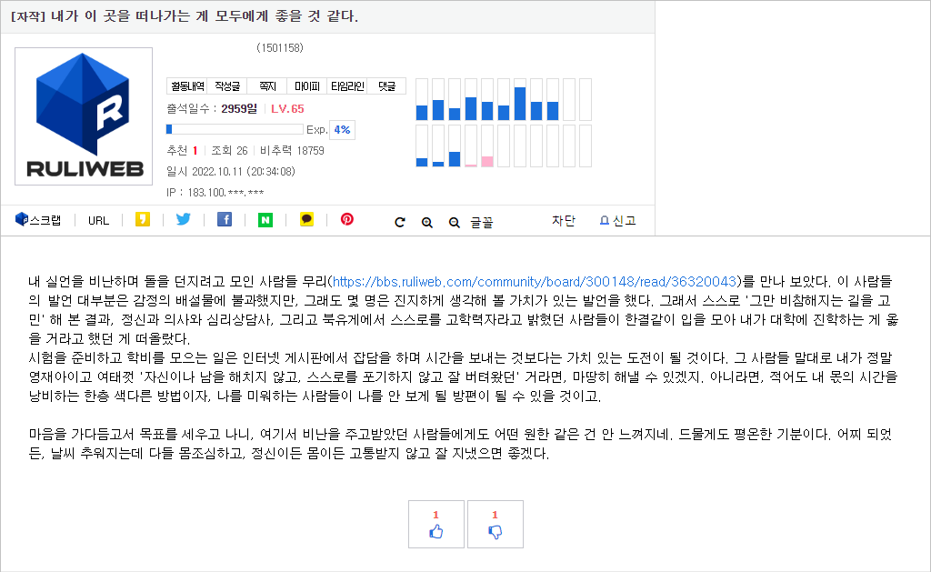 그래. 잘 기억하고 있네. 하지만, 살다 보면 종종 '어 이거 다시 생각해 보니 킹받네' 라는 생각이 들 때가 있잖아? 최근 자폐아가 친 사고가 화두가 되는 걸 보니 그렇게 되더라고. | 23.07.27 01:32 | | |