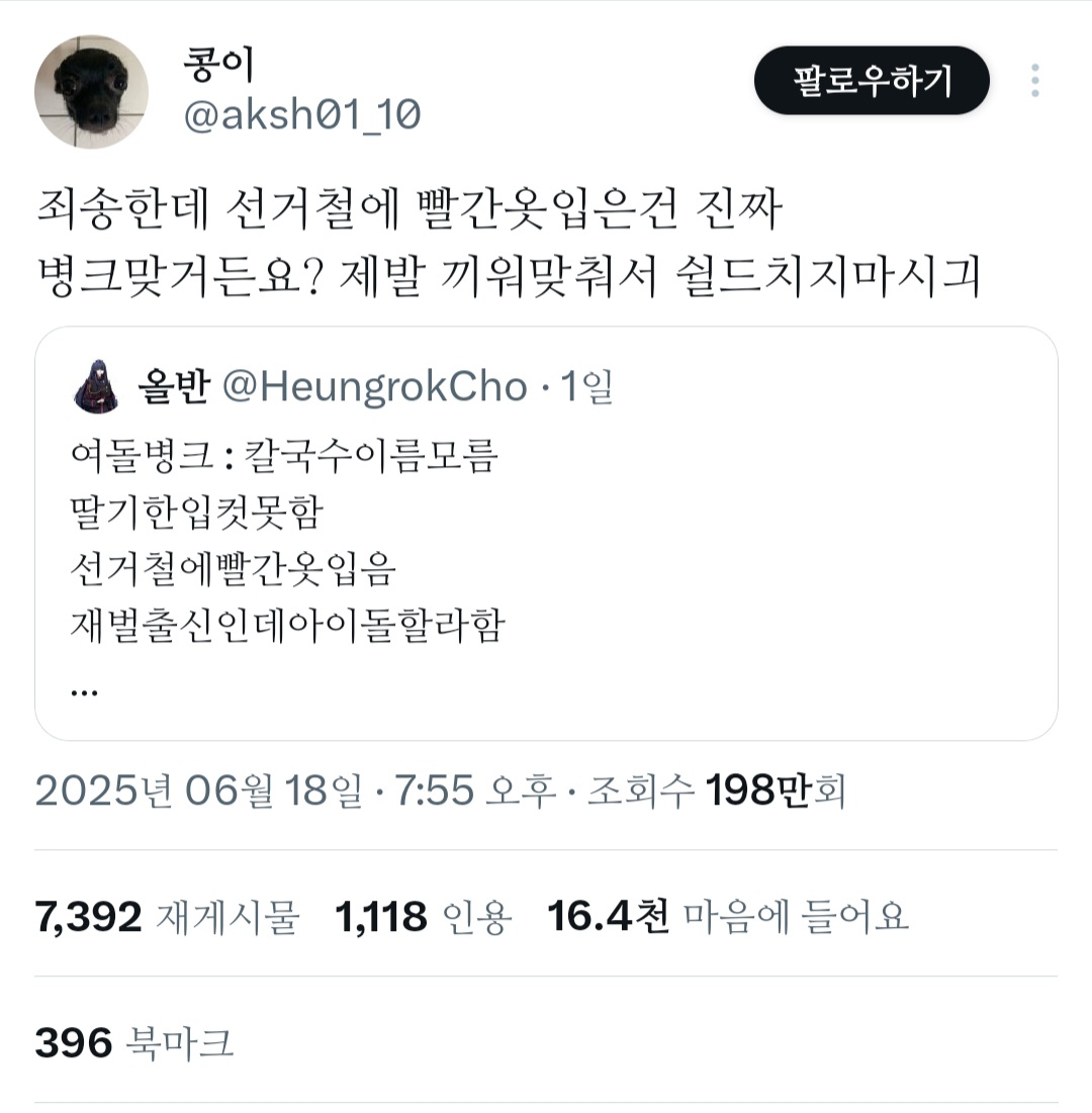 최근 남돌 병크가 겁나 터지다보니 '여돌들은 이딴것도 병크라하면서' 하는 빌드업의 흔한 트윗질 같음 | 25.06.19 20:46 | | |