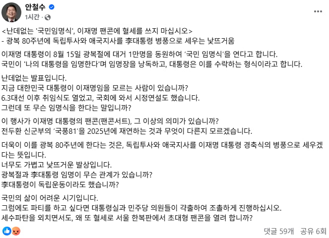 민생 어렵다고 미래세대 호주머니에 있던 돈 빼앗아서 뿌려놓고는, 대관식을 하겠다고? 그것도 광복절에? ㅁㅊㄴ인가?