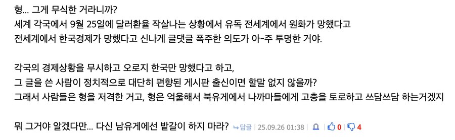 옆에놈도 망했으니까 우리 망한 건 문제가 아니라는 것도 웃기는데, 정작 우리가 걔들만큼만 망한 것도 아닌데 그 부분 기를쓰고 뭉개려 하는 게 개웃김 ㅋ. | 25.10.02 18:07 | | |