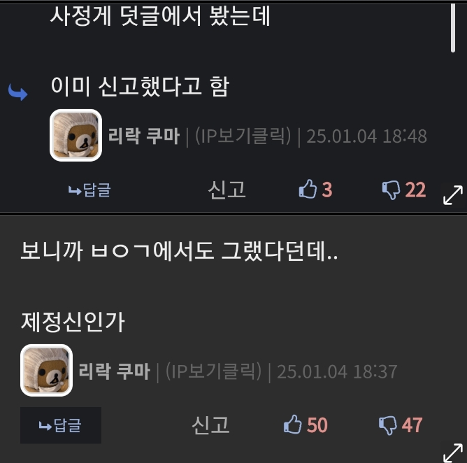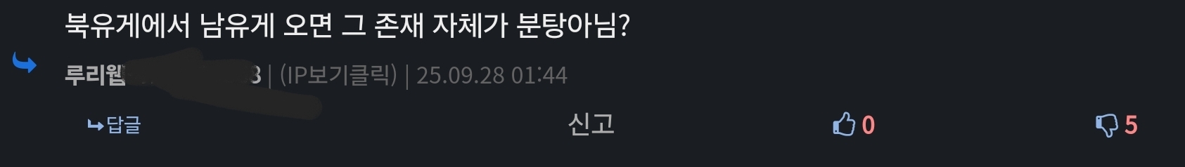 나도 북유게나 사정게나 이러는게 다 사정게이라고 봐서 그러는 건 아님 네가 봤다면 그런 유저도 있겠지 북유게나 사정게나 그냥 떡밥 보기 싫은 사람도 있고 은근슬쩍 묻어가려 들거나 알면서 모르는 척 장난치는 유저도 있다고 | 25.10.02 18:29 | | |