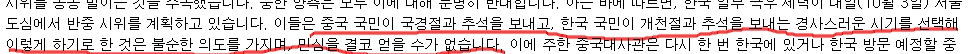 이와 동시에 저희는 유감스럽게도 한국의 개별 정치인이 허위 정보를 퍼뜨리고, 일부 극우 단체가 중국 관광객이 모이는 서울 명동, 대림동 등에서 반중 시위를 종종 벌이는 것을 주목했습니다. 중한 양측은 모두 이에 대해 분명히 반대합니다. 아는 바에 따르면, 한국 일부 극우 세력이 내일(10월 3일) 서울 도심에서 반중 시위를 계획하고 있습니다. 이들은 중국 국민이 국경절과 추석을 보내고, 한국 국민이 개천절과 추석을 보내는 경사스러운 시기를 선택해 이렇게 하기로 한 것은 불순한 의도를 가지며, 민심을 결코 얻을 수가 없습니다. 이에 주한 중국대사관은 다시 한 번 한국에 있거나 한국 방문 예정할 중국 관광객들에게 높은 경각심을 가지고 신변 안전에 유의할 것을 당부드립니다. 또한 한국측이 재한 중국 국민들의 신변 안전과 합법적 권익을 철저히 보장해 주는 것을 엄정히 요청합니다.
