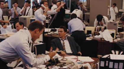 서류 휘날리고 분주하게 누군가가 돌아다니고 있고 책상위나 바닥은 정돈되지 않은채 지저분하고
