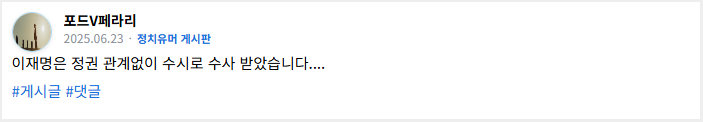 정권 관계없이 수시로 수사받은 사람이면...어...정치적 논리 끼어들 틈 없이 그냥 수시로 범죄 혐의 만든 거잖아 | 25.10.14 13:23 | | |
